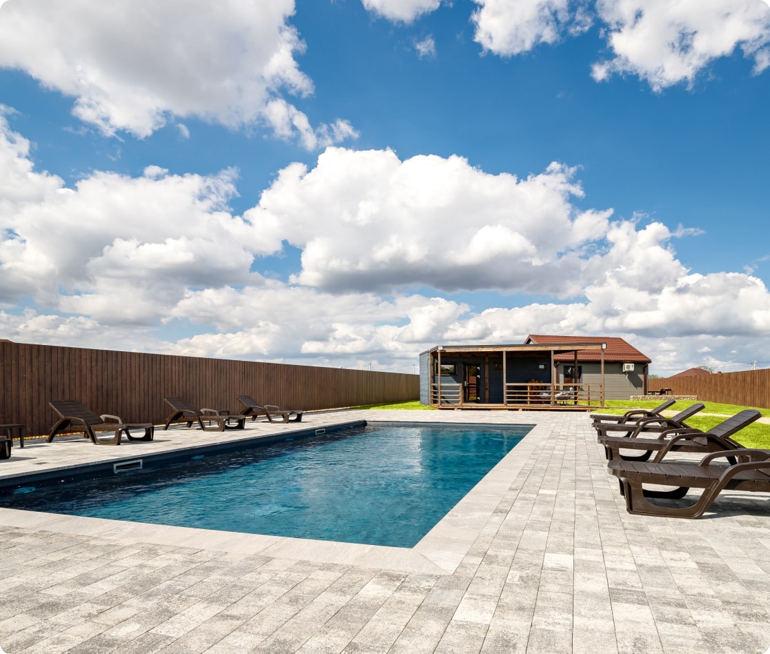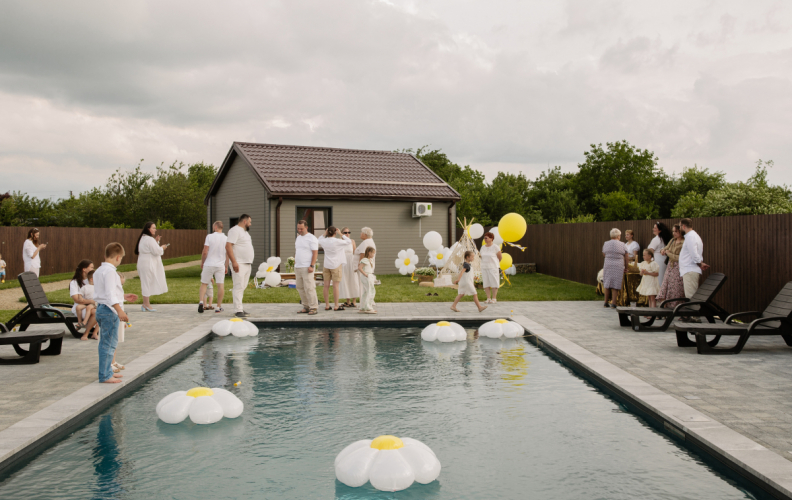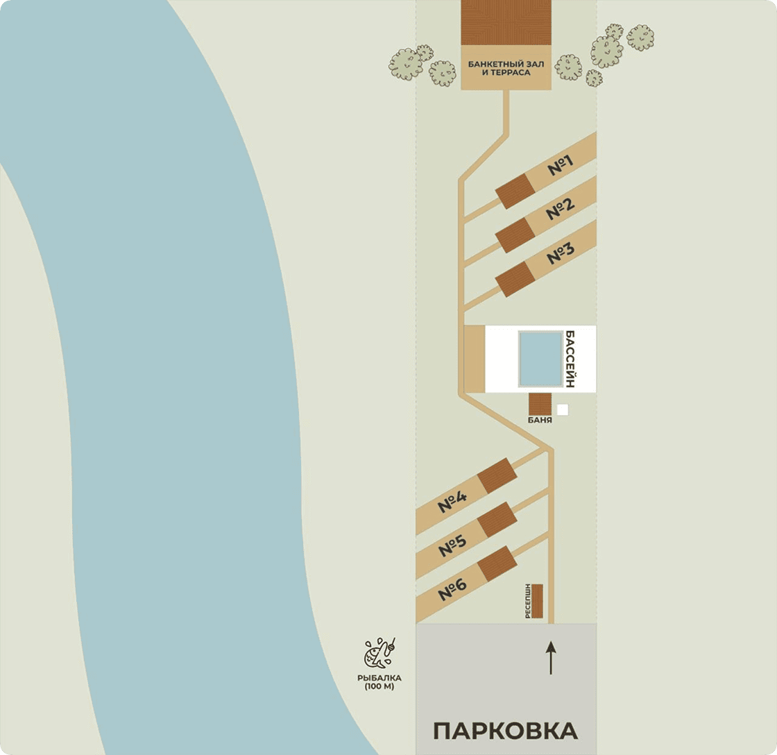 На территории нашего комплекса имеются подогреваемый бассейн, 6 комфортабельных домиков, оборудованные места для рыбалки, банкетный зал и терраса.